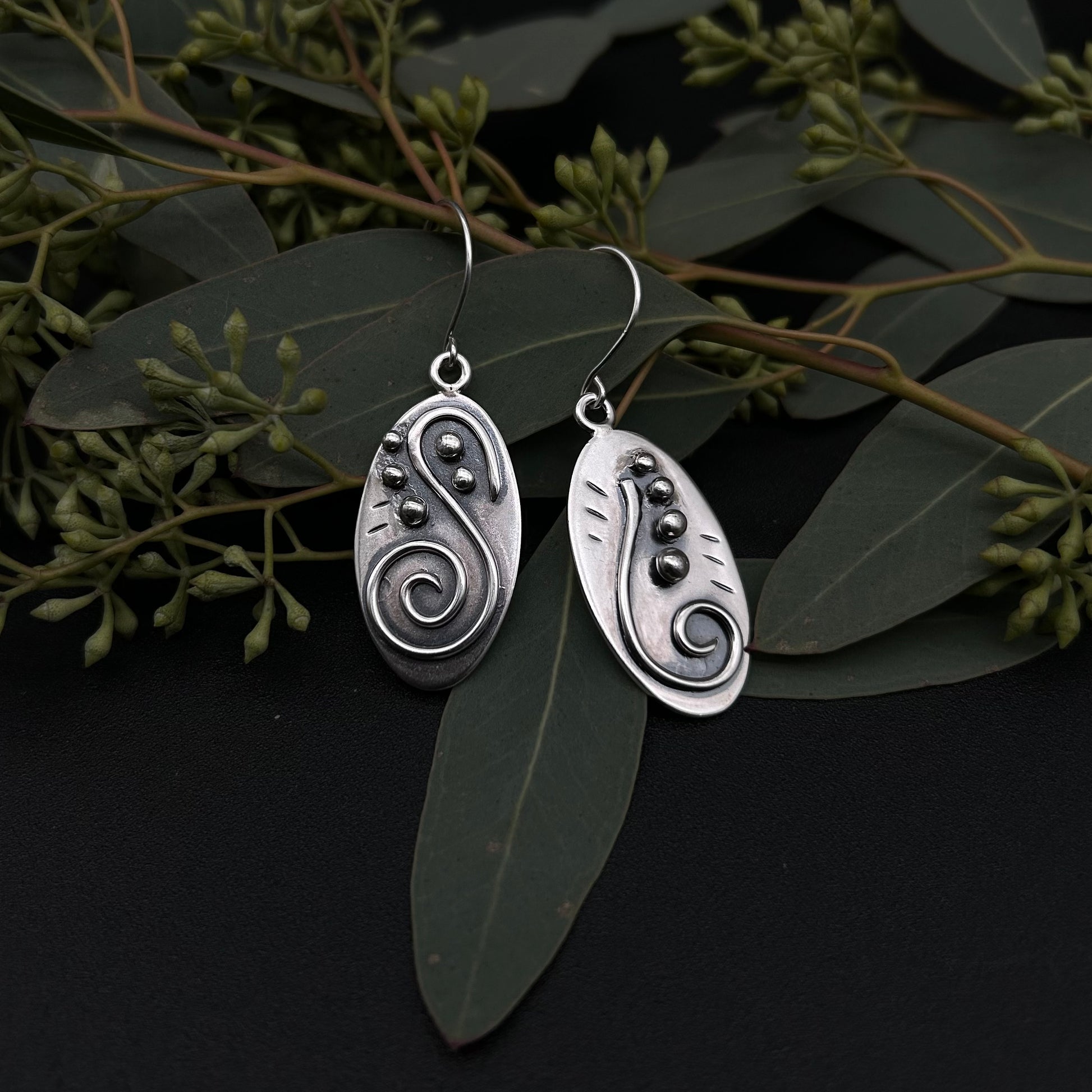 These earrings have asymmetrical sterling silver components soldered onto the base of the earrings. They hang at about 1.5" on sterling silver wire.