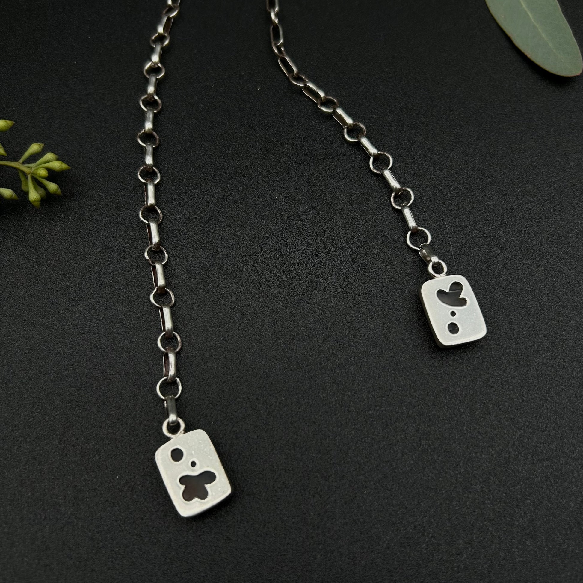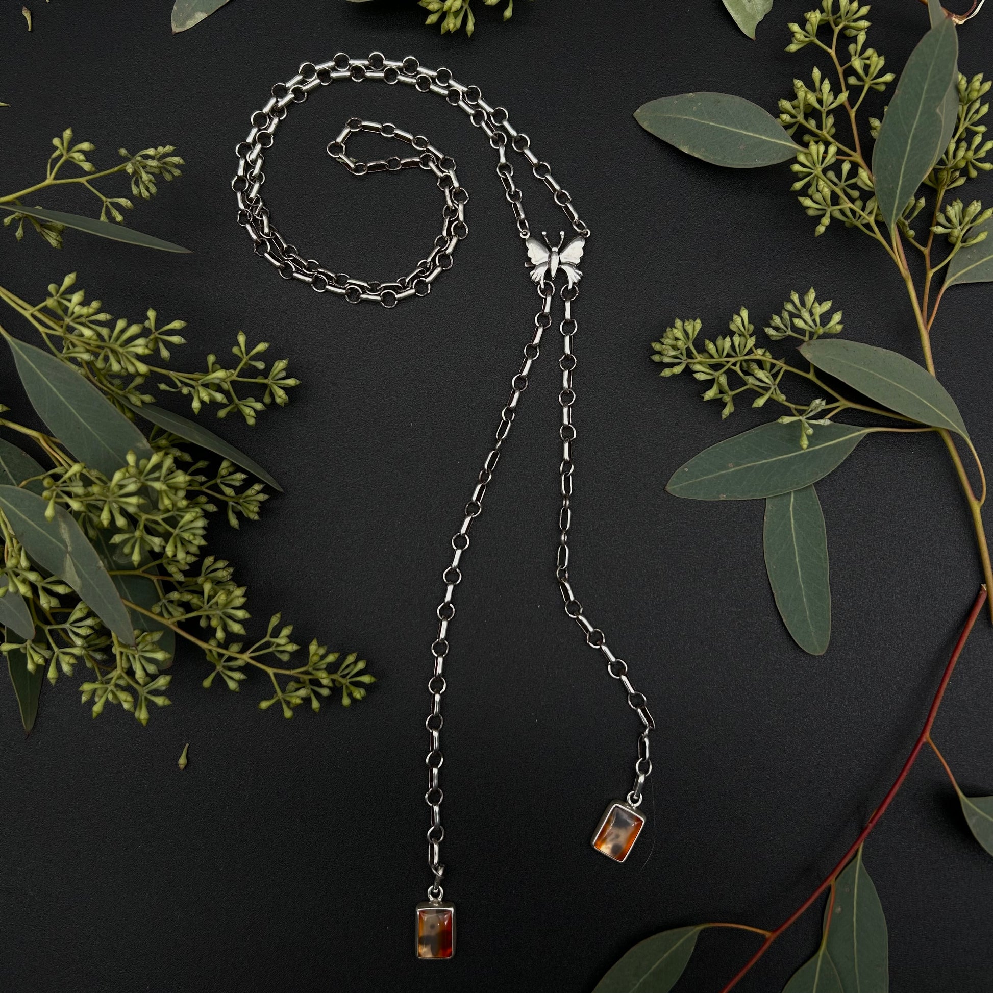 This product features a functional sterling silver butterfly clasp with two carnelian charms at the base of the chain.
